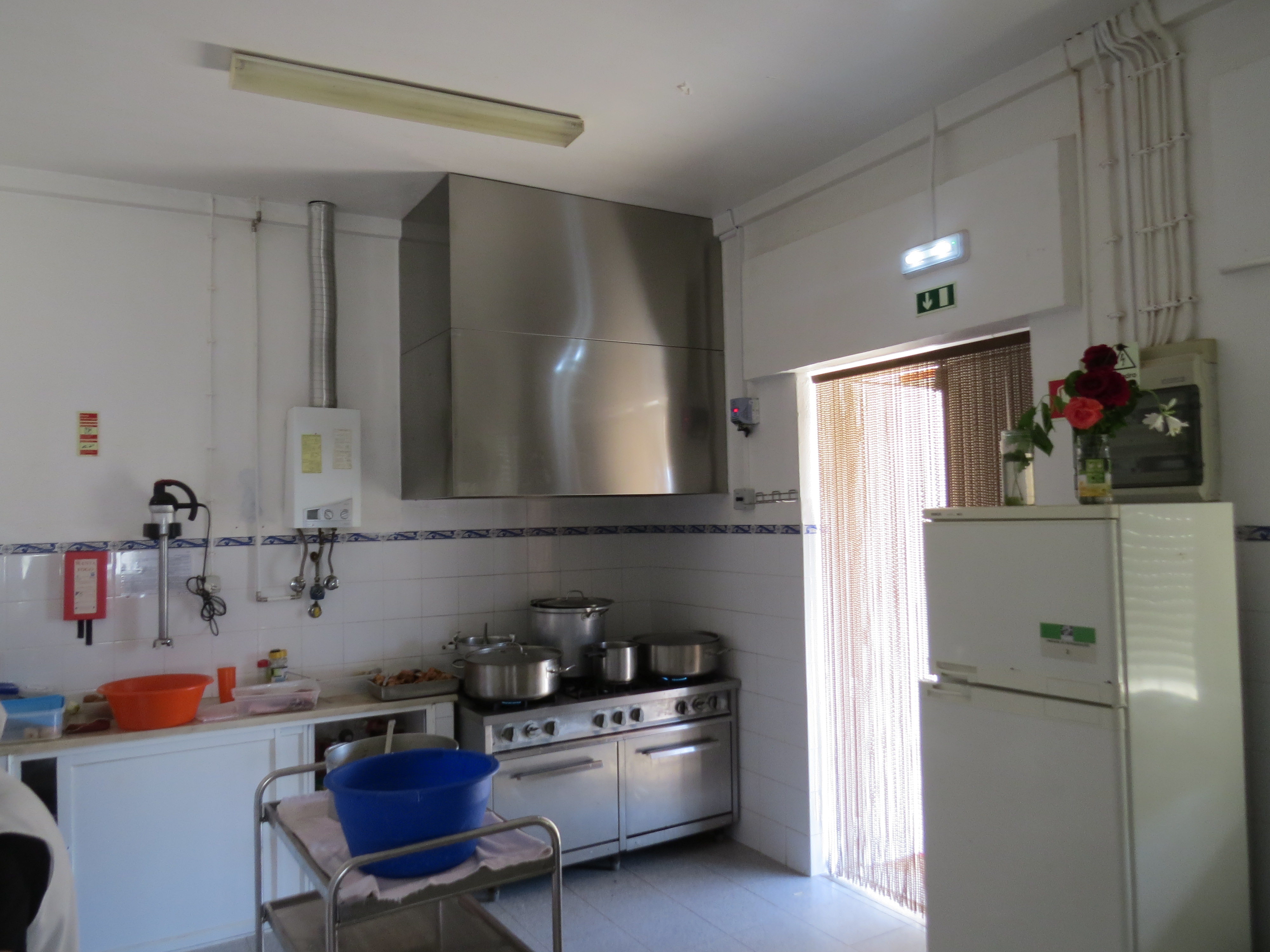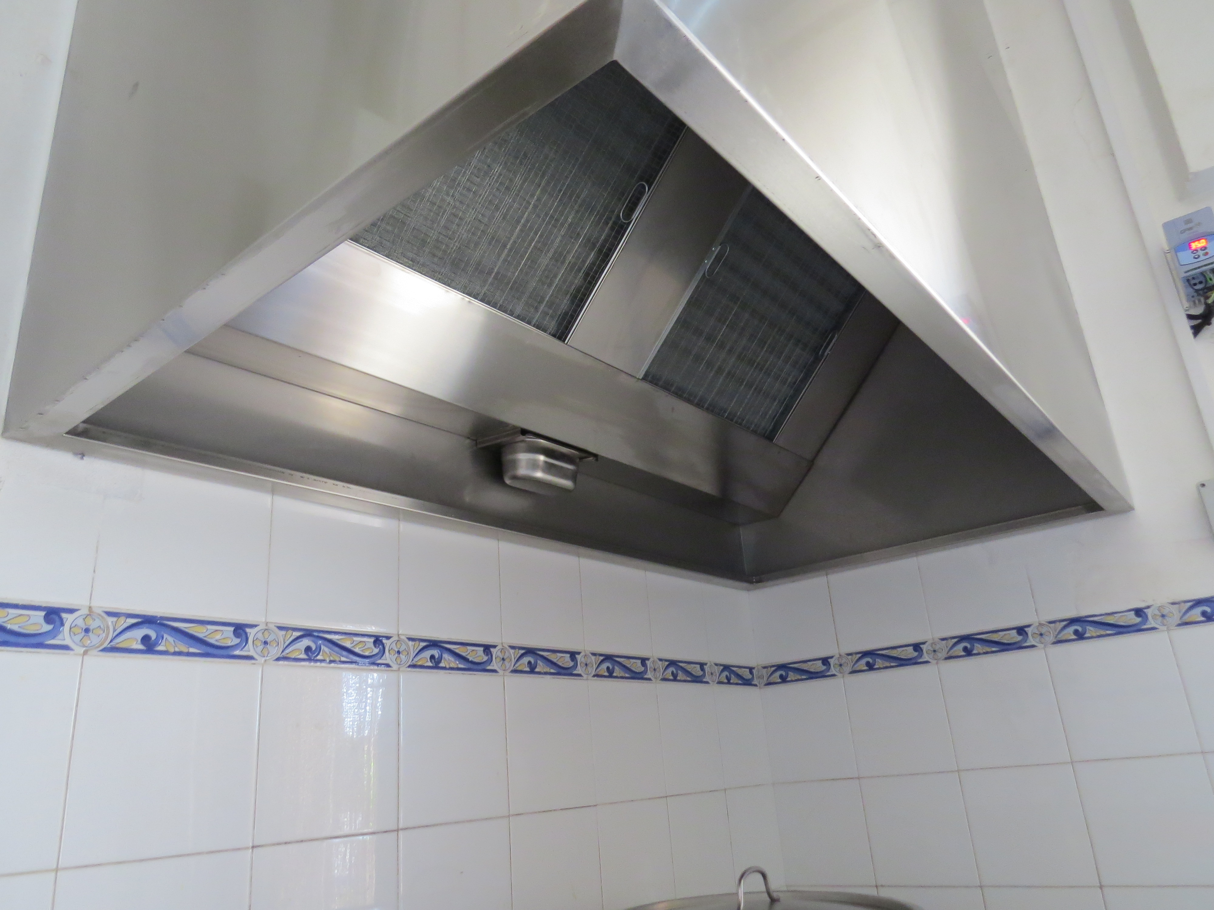 Demolição de chaminé interior existente, execução de chaminé exterior e fornecimento e montagem de hotte de exaustão de fumos e vapores com controlador em cozinha industrial.