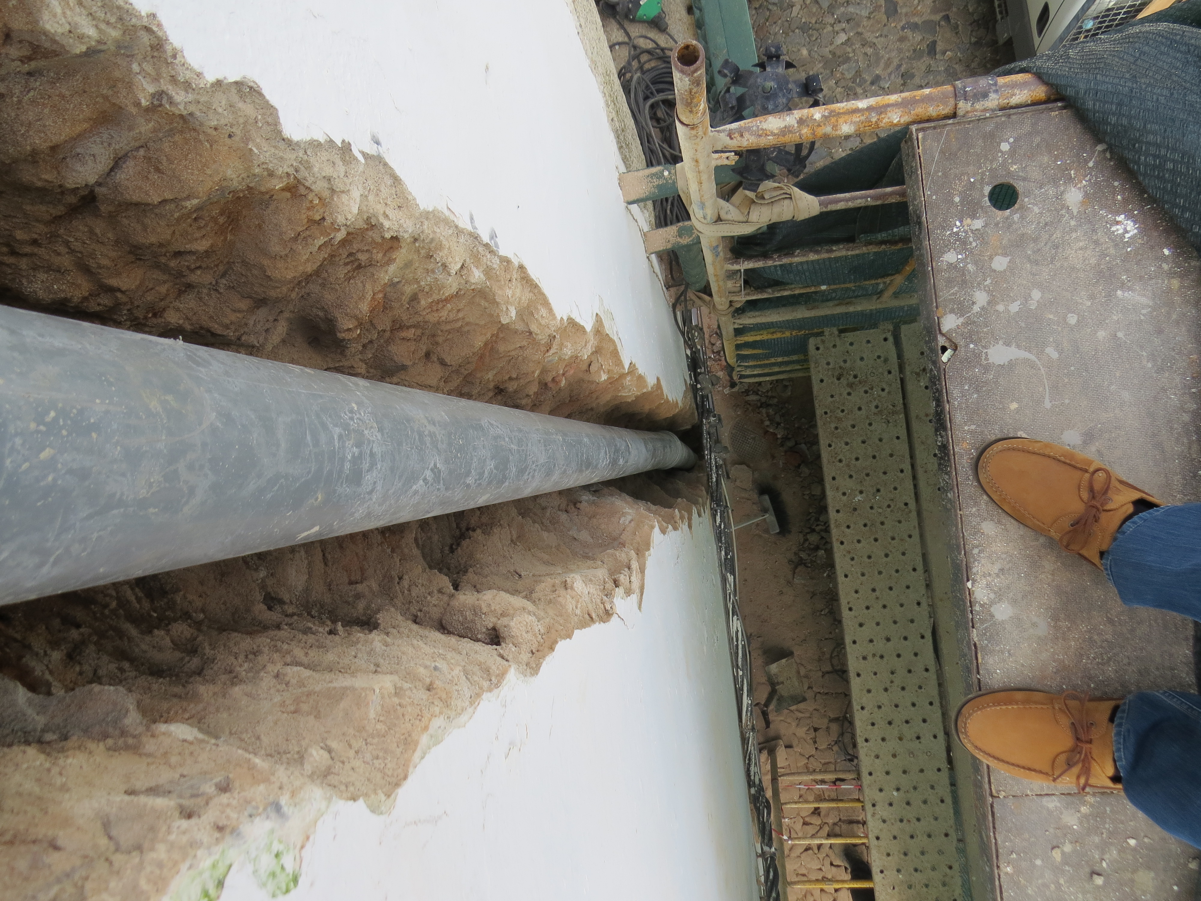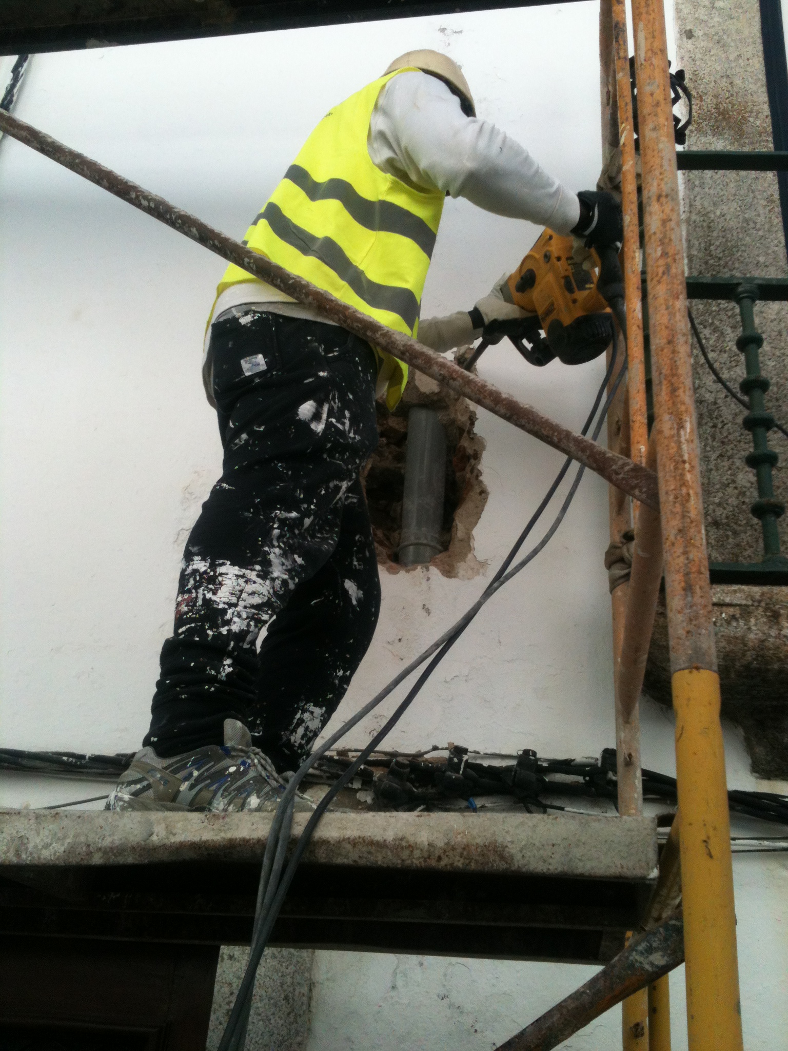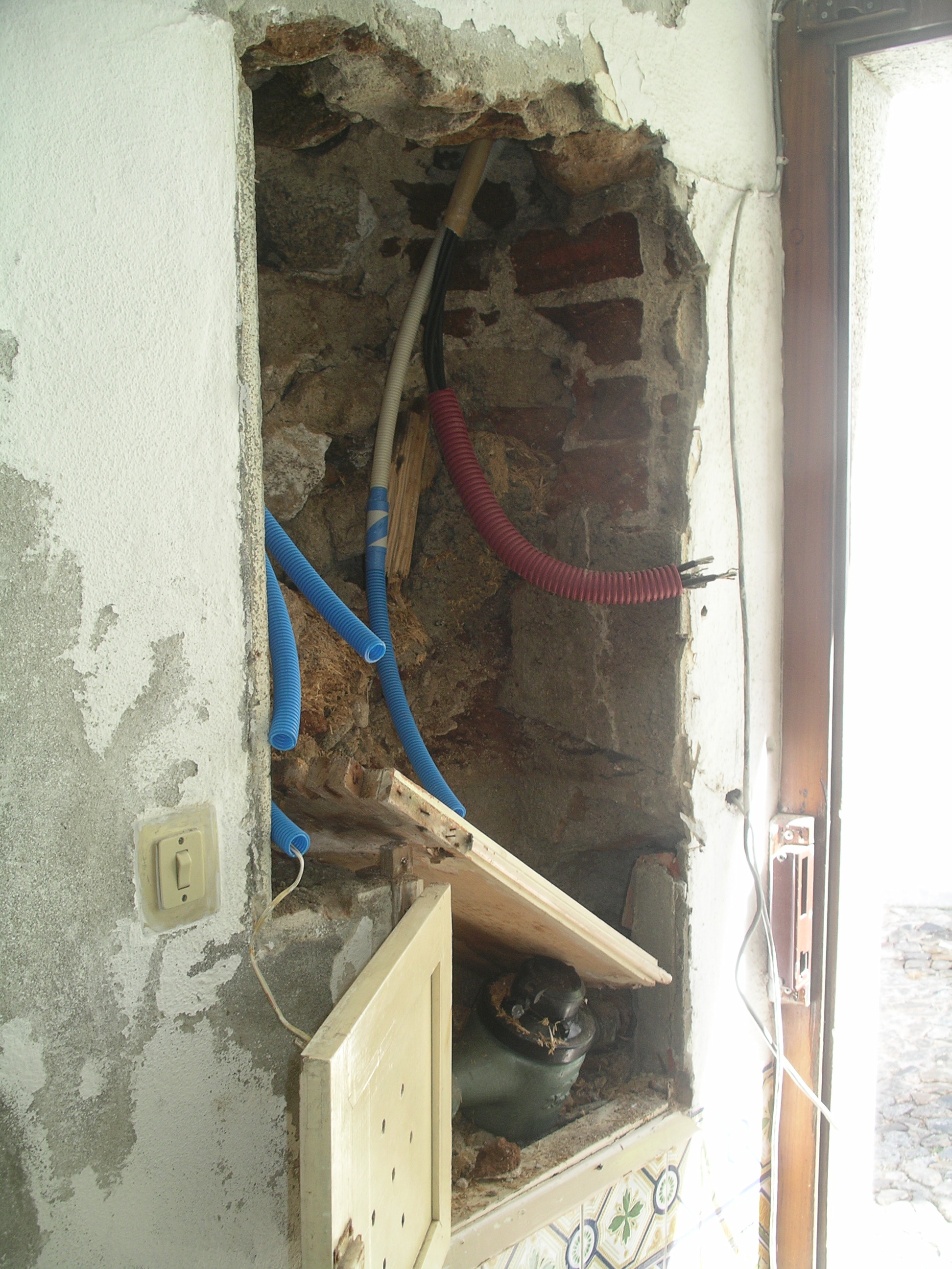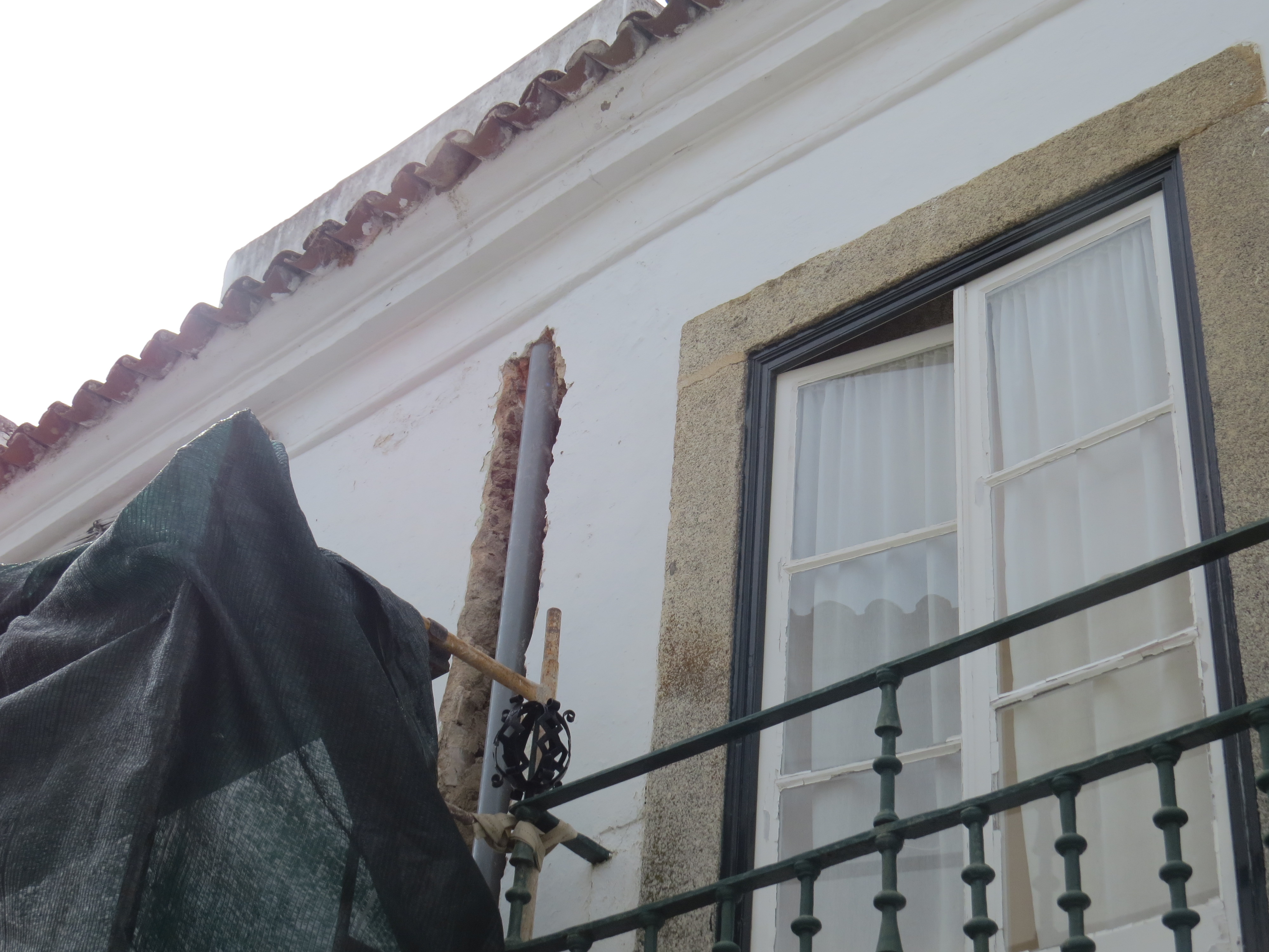 Reparação de tubagem com fissuração, dando origem a infiltrações interiores, com a abertura de roço na fachada e substituição de tubagem. Execução de ensaios de descargas para verificação de estanquicidade das tubagens antes do seu tapamento.